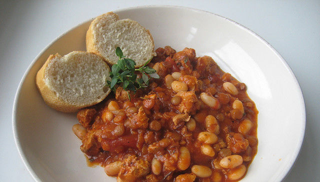 Luego, agregar los chorizos cortados en rodajas, un poco más de agua hasta cubrir otra vez la preparación.